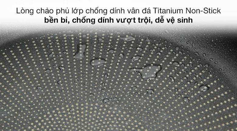 - Lòng chảo phủ lớp chống dính vân đá Titanium Non-Stick bền bỉ, có thể sử dụng không hoặc ít dầu khi nấu ăn.