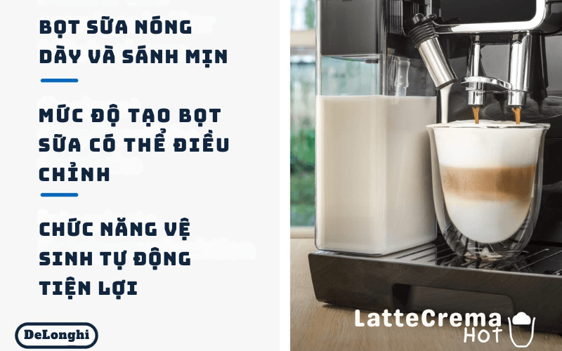 Bình đánh sữa đi kèm có dung tích 600ml, được trang bị công nghệ LatteCrema độc quyền của De’Longhi, tạo ra lớp bọt sữa mềm mịn, sánh quyện như kem hoàn toàn tự động.