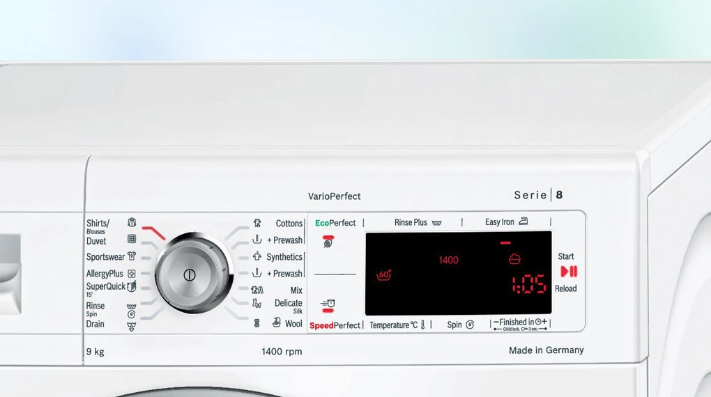 – Máy giặt Bosch có 14 chương trình giặt giũ được cài đặt sẵn, ví dụ như: giặt chăn ga, giặt sơ đồ tổng hợp, áo sơ mi, đồ hỗn hợp, giặt nhanh 15 phút, xả + vắt,… (xem thêm tại bảng thông số kỹ thuật) tùy theo từng loại đồ dùng, trang phục mà bạn lựa chọn chương trình giặt phù hợp để giặt sạch quần áo đồng thời tiết kiệm điện, nước hơn.