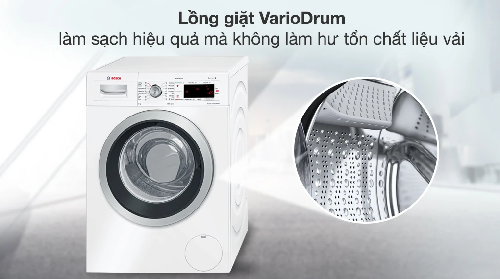 – Lồng giặt VarioDrum có cấu trúc mái chèo giúp phân bổ lượng nước đồng đều cho phép đánh bật các vết bẩn cứng đầu dễ dàng trong khi không làm hỏng chất liệu quần áo từ đồ dày cho đến đồ mỏng, nhờ đó giúp tăng tuổi thọ cho trang phục của bạn tối ưu.