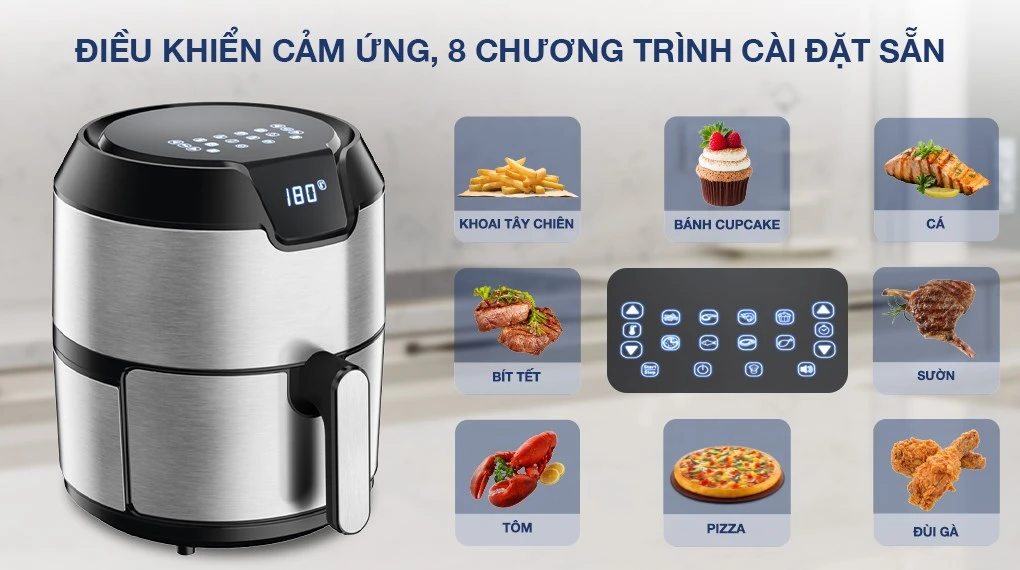 Gồm: khoai tây chiên, bít tết, tôm, bánh cupcake, pizza, cá, sườn, đùi gà. Điều khiển cảm ứng có màn hình hiển thị giúp dễ dàng theo dõi và tùy chỉnh nhiệt độ, hẹn giờ phù hợp.