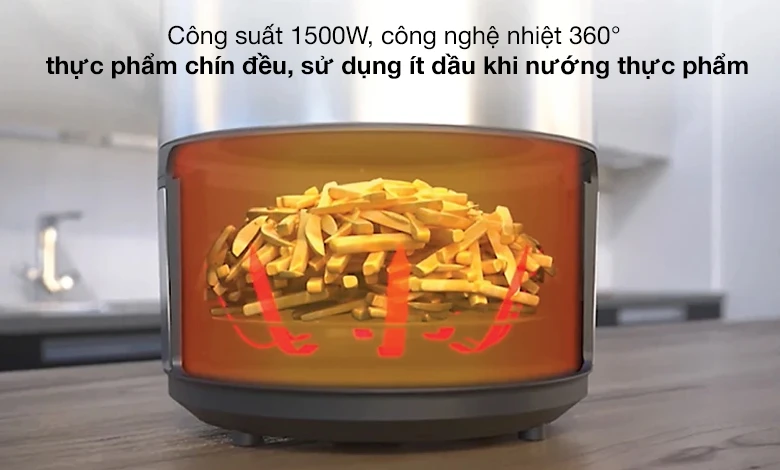 Công suất mạnh mẽ 1500W, công nghệ nhiệt 360° giúp thực phẩm chín đều, cần ít hoặc không cần dầu khi nướng thực phẩm
