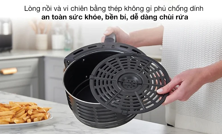 Lòng nồi và vỉ chiên bằng thép không gỉ phủ chống dính, an toàn sức khỏe, bền bỉ, khó bong tróc, dễ chùi rửa